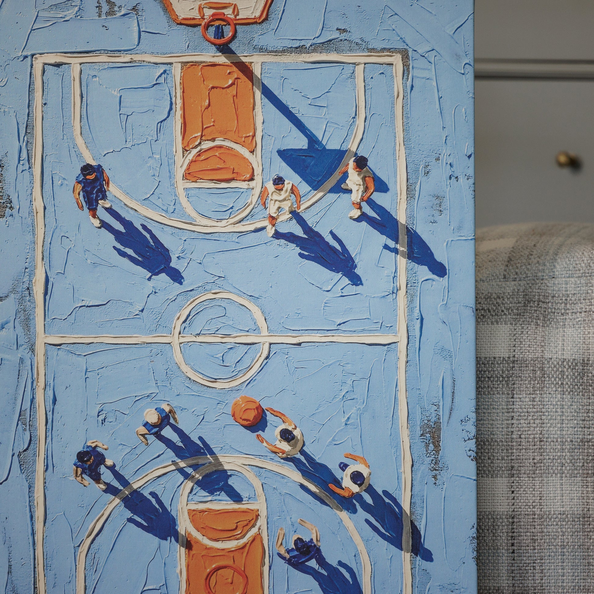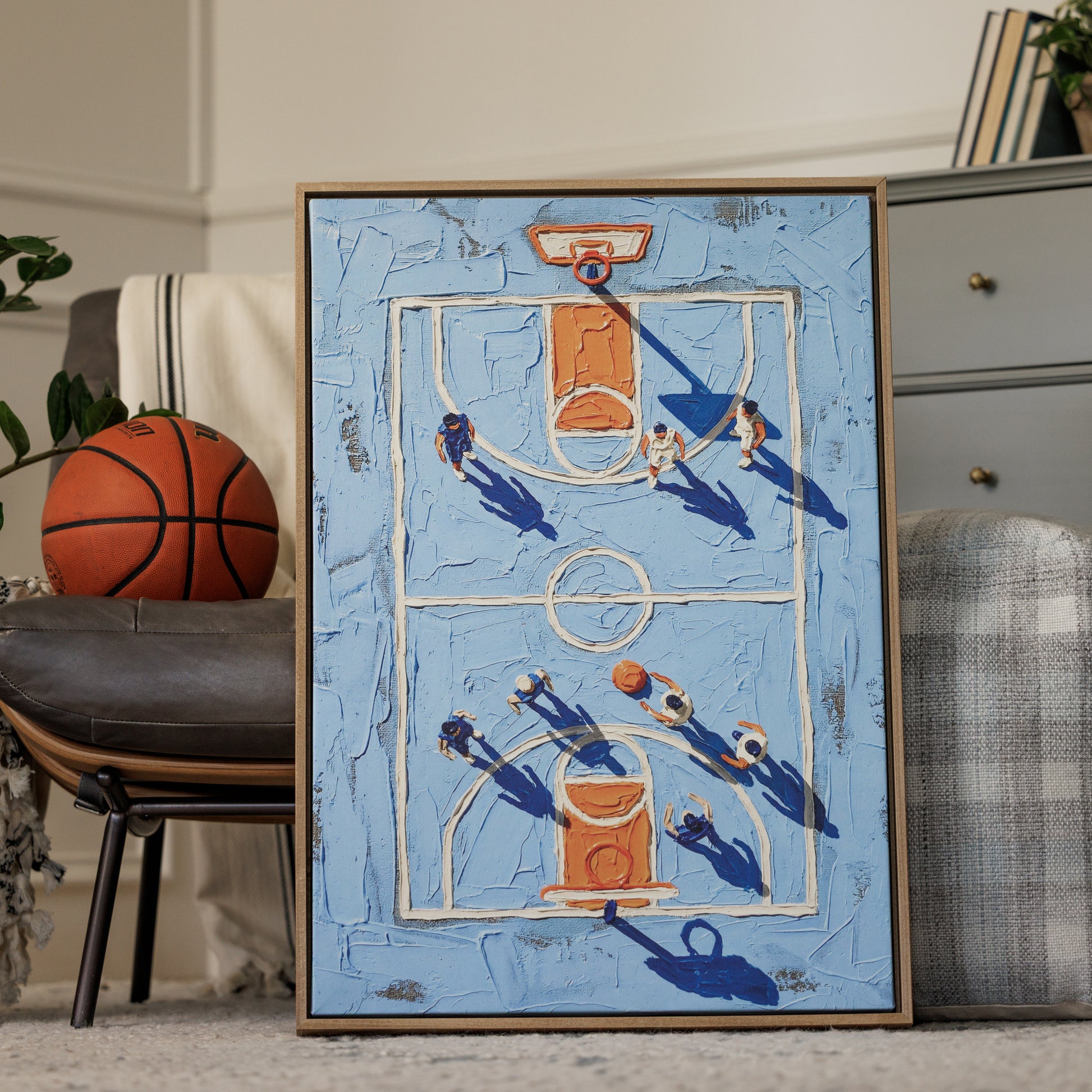 A bird's-eye view of the court you've never seen quite like this. "Top of the Key" takes bold blues and oranges and flips the perspective — literally — giving classic basketball decor a clean, unexpected edge.