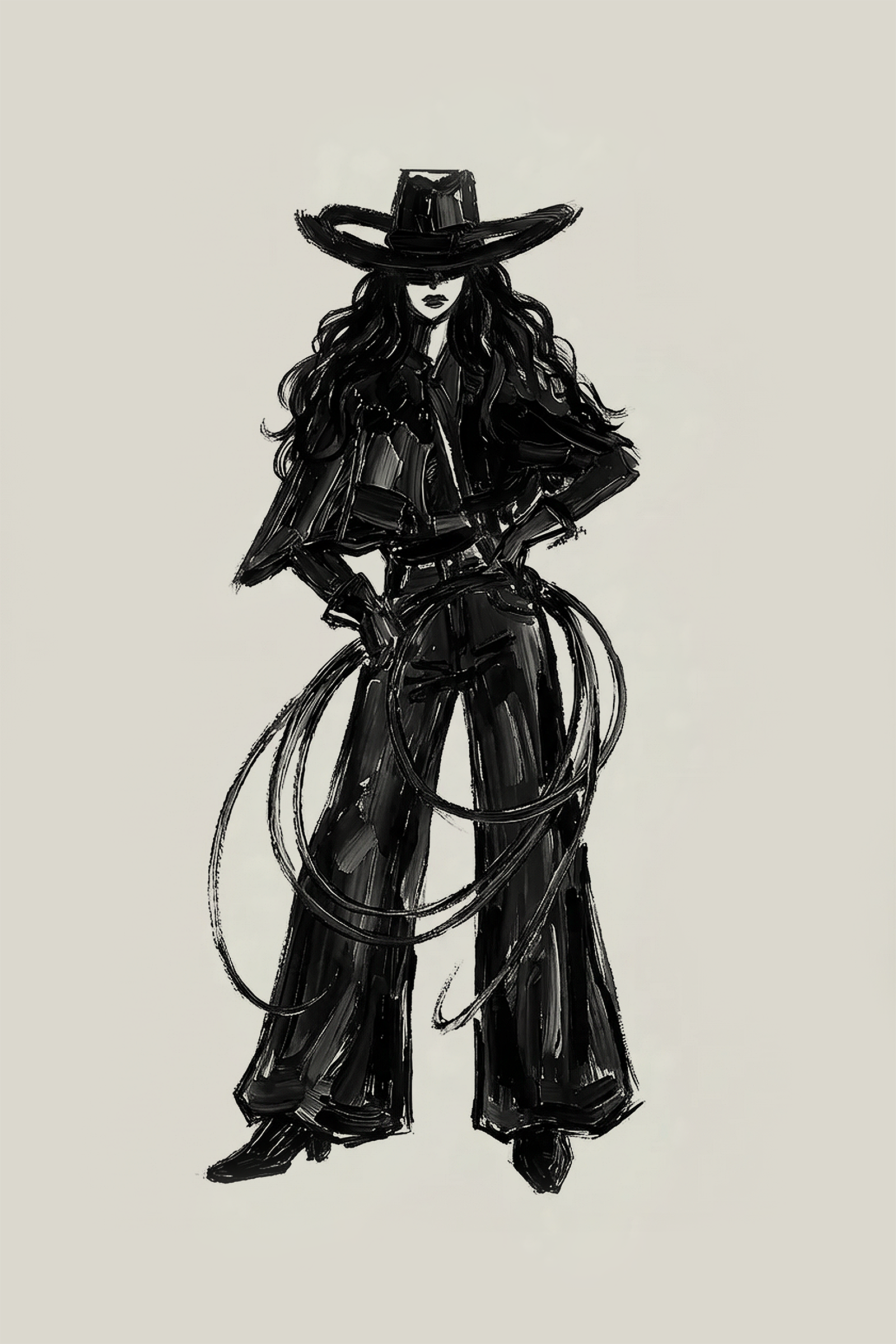 Confidence isn't just an attitude; it's a direct gaze that says you're ready for anything. This piece embodies fearless energy: a cowgirl facing you head-on, lasso in hand, ready to take on the world. The high-contrast design focuses on her unwavering strength and form, reminding you that you are the one in control of your story.