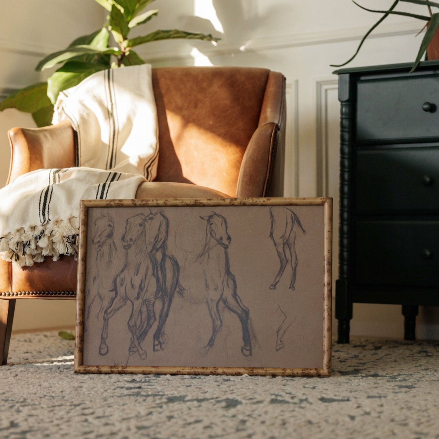 It’s not just about the sketches; it’s about how they’re showcased. We’ve paired this artwork with our custom frame style Natural Burl designed to ground the piece without stealing the spotlight. The rich textures and thoughtful craftsmanship of the frame enhance the rustic, hand-drawn quality of the art, making it feel like a collected treasure rather than just another decoration.