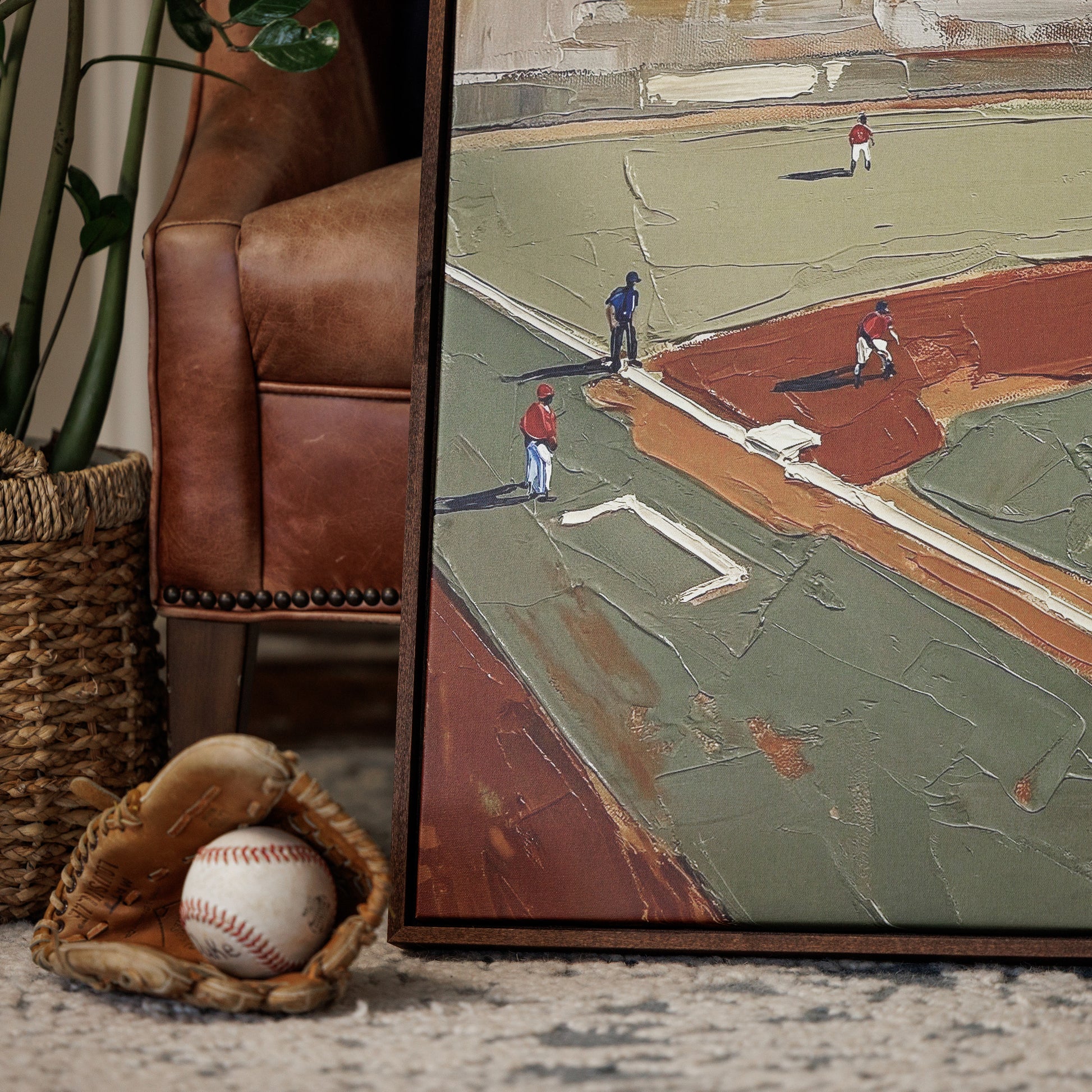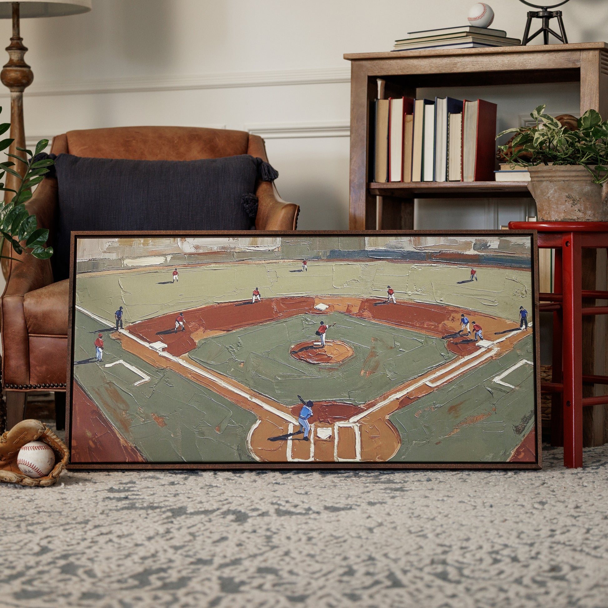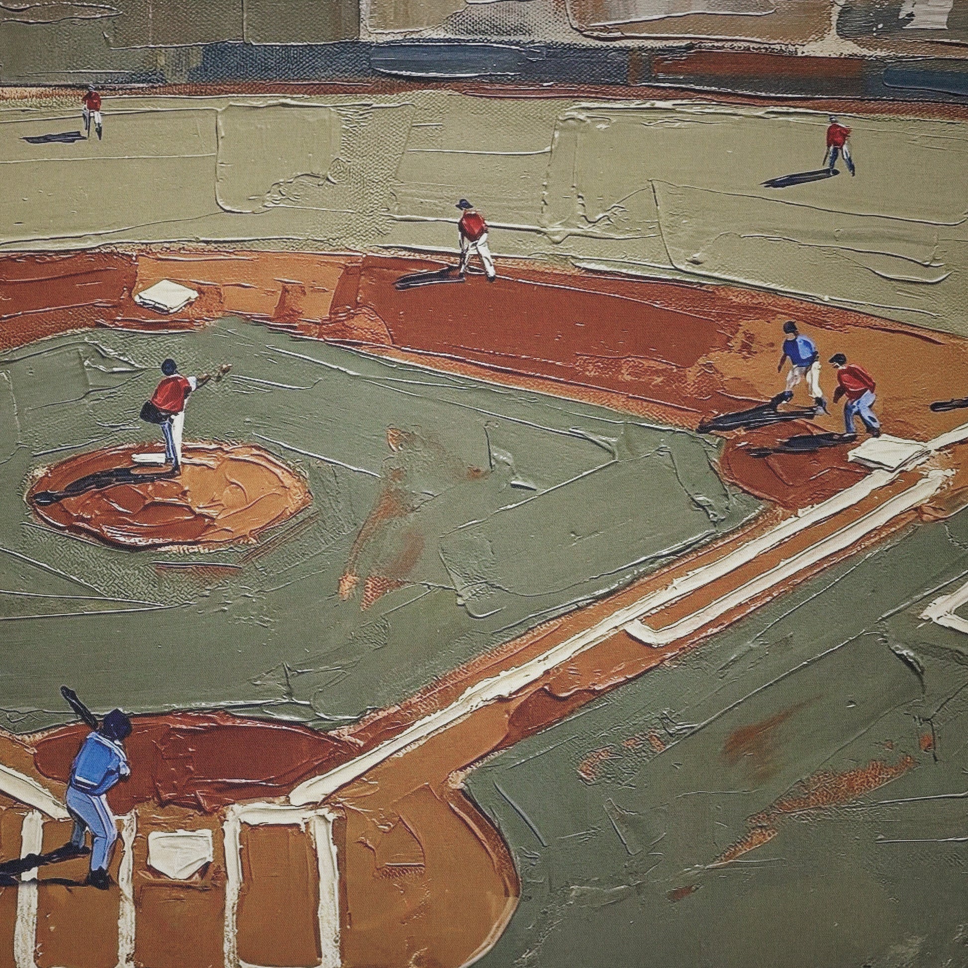 Overhead greens and deep diamond browns give "On the Field" the feel of a perfect Saturday at the ballpark. This isn't your dad's baseball poster — it's a modern, artful angle on the game that looks sharp in any room where your crew gathers.