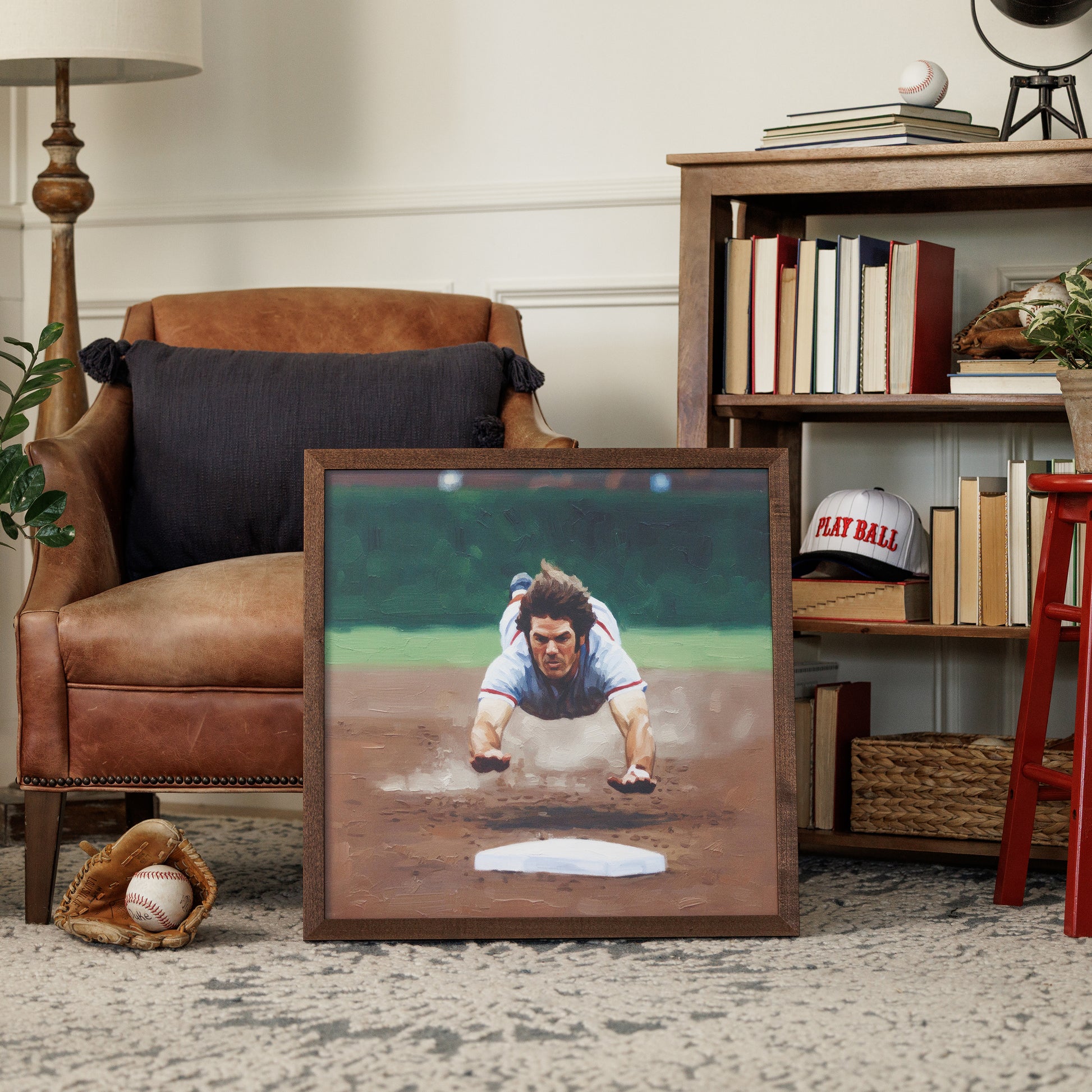This piece captures the split-second decision that defines the game — going all in. "Headfirst Hustle" freezes the moment of a full-extension dive into the dirt, where instinct takes over and effort leaves everything on the field.