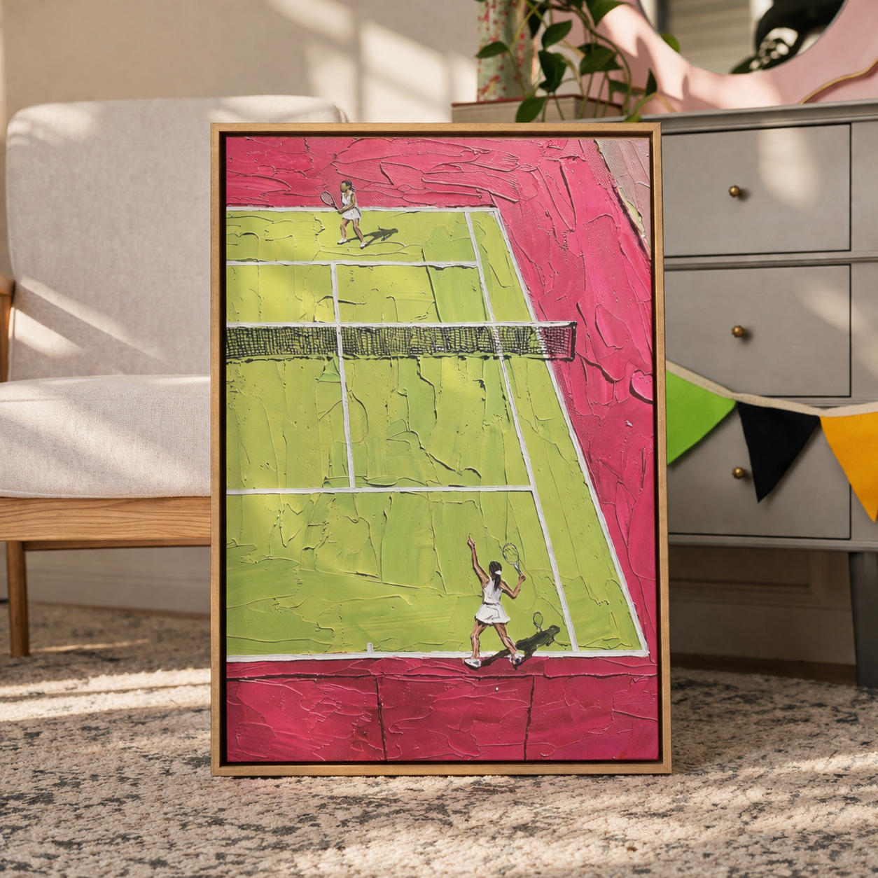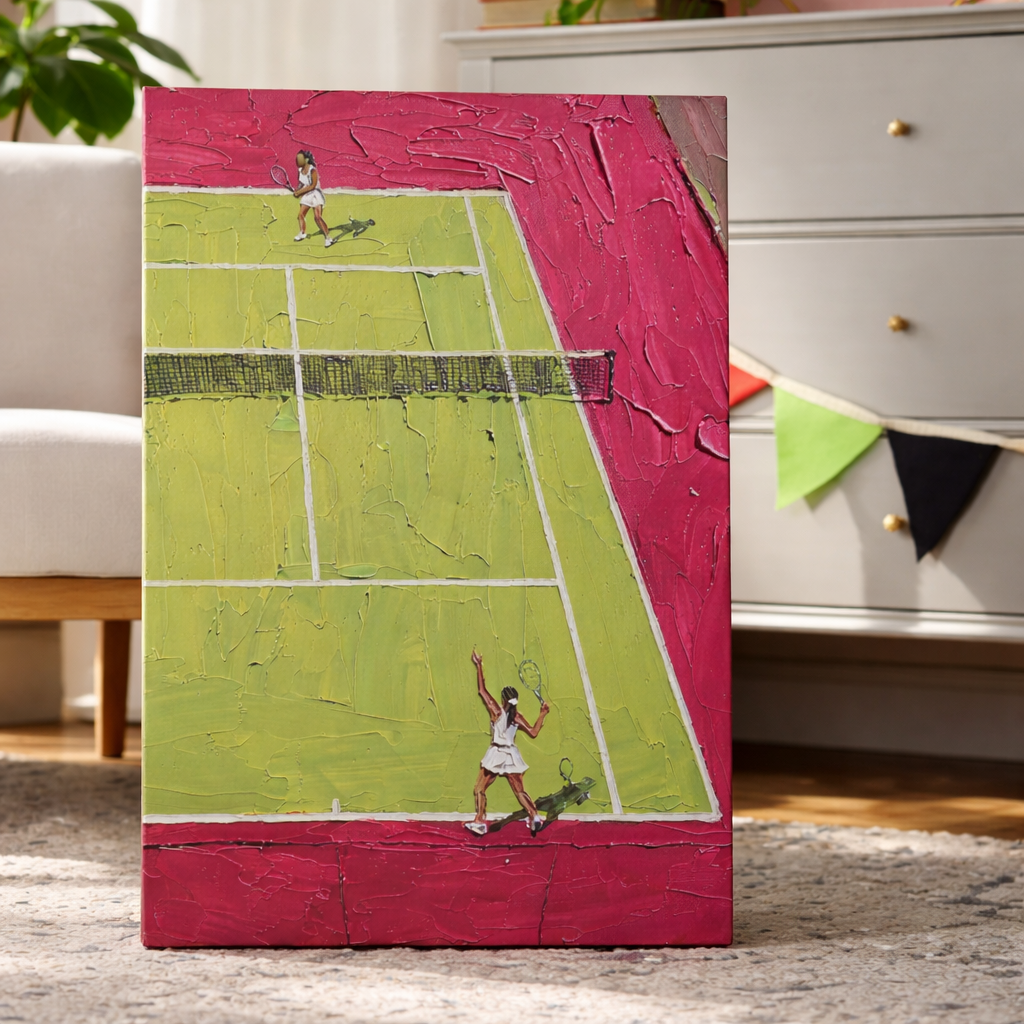 Pink. Green. Pure energy. "Rally" takes the tennis court and turns it into an abstract burst of color that doesn't look like anything else on your wall. It's playful, it's bold, and it works whether your house runs on match points or you just love great design.