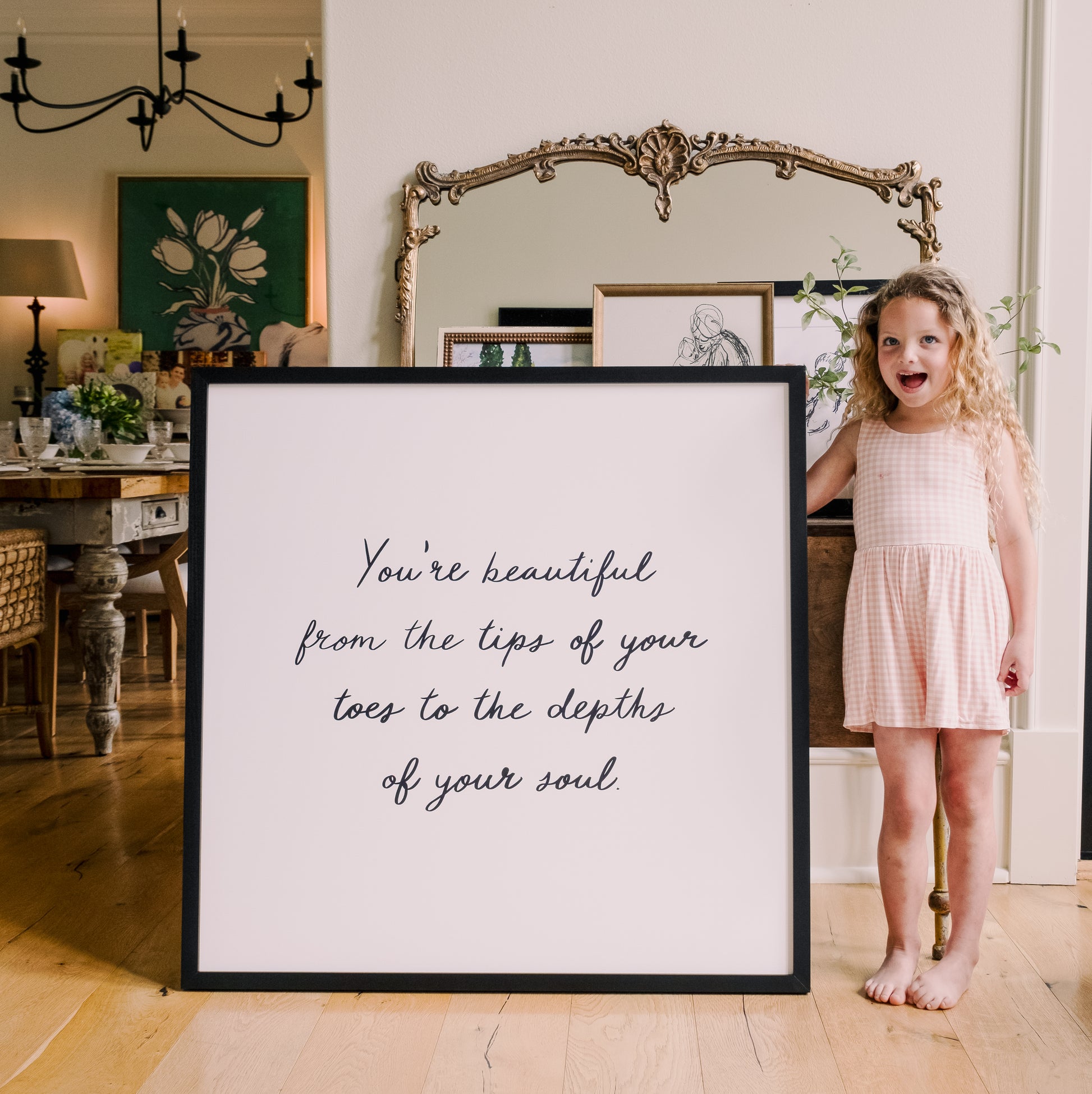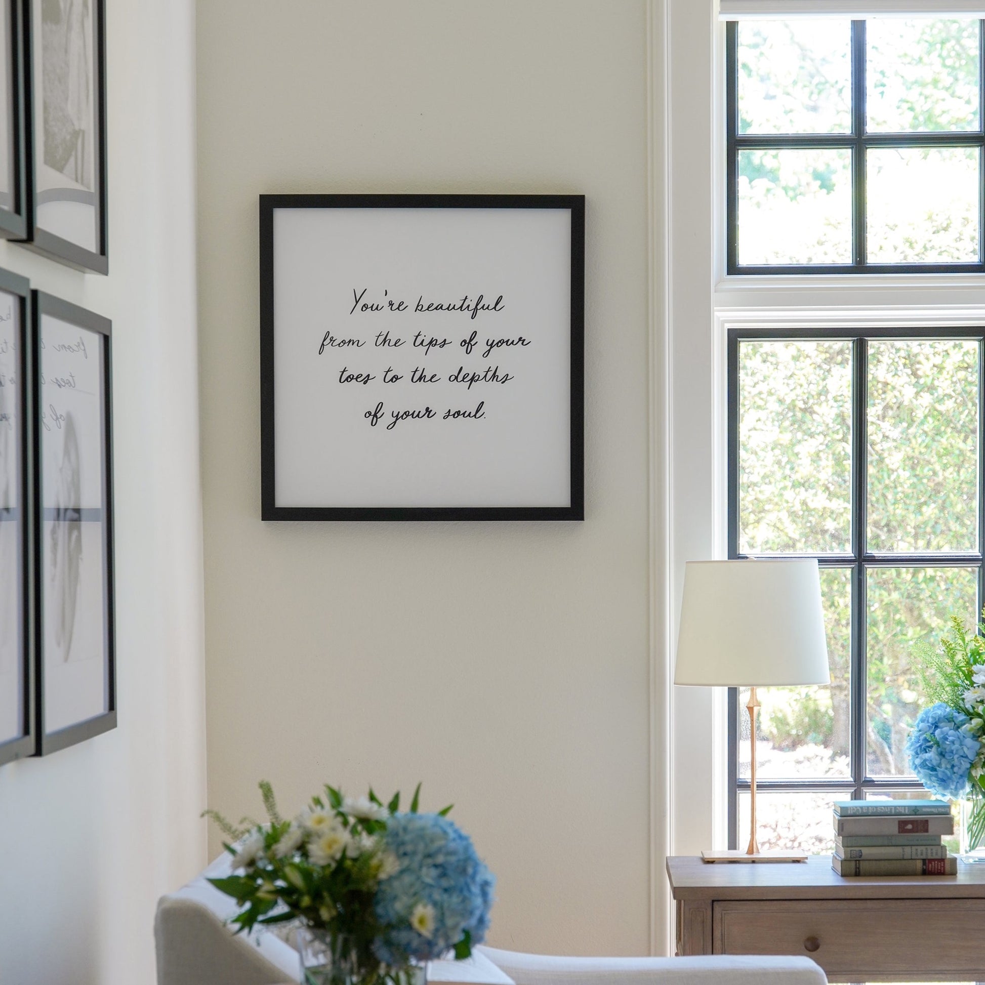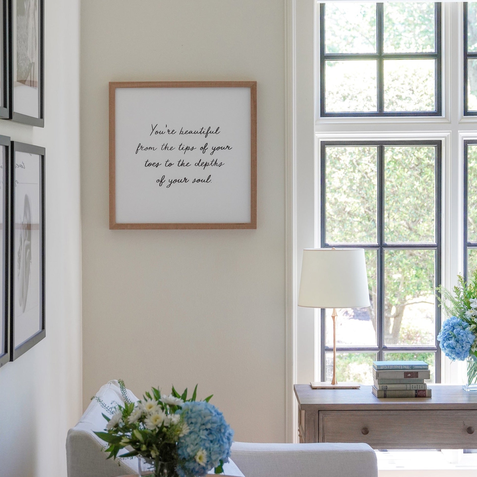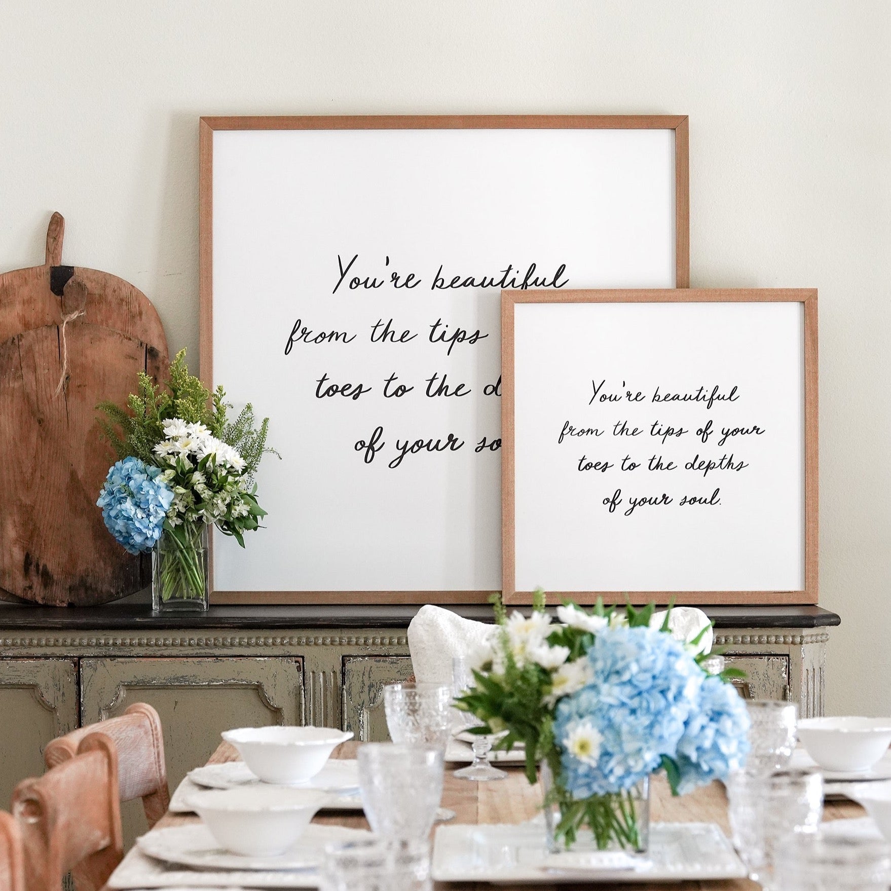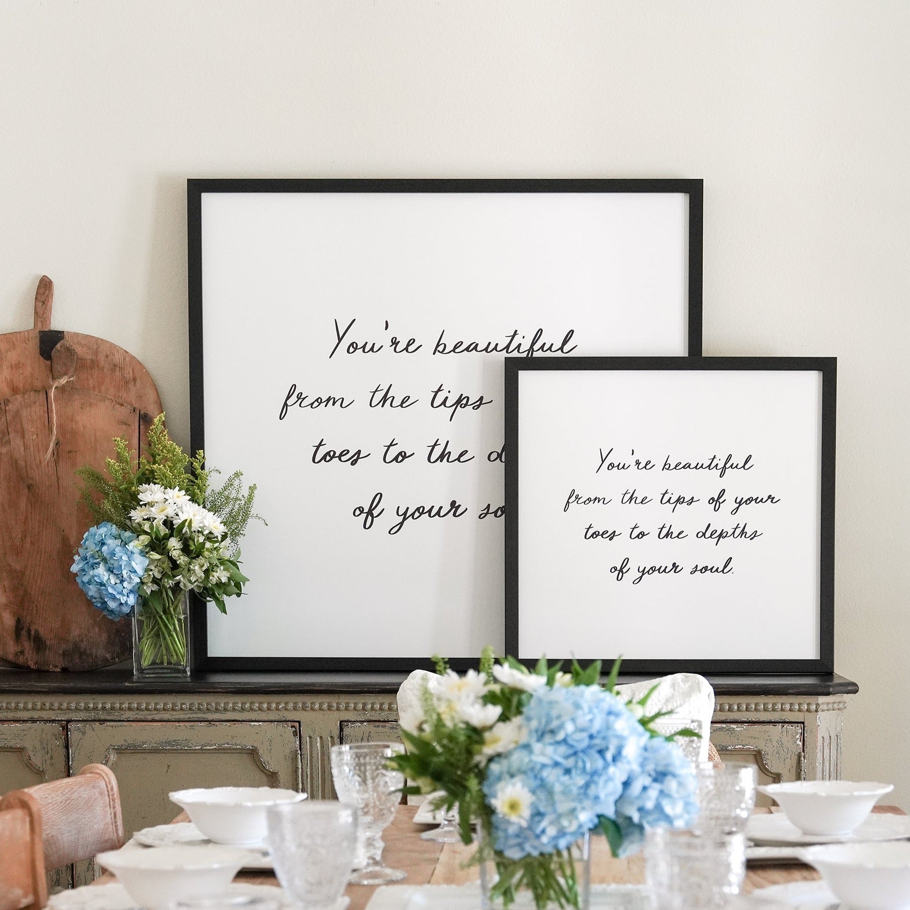 Make every day beautiful with our "You're Beautiful" sign! Whether you choose our over sized frame option or the classic square, it's sure to bring beauty to any space. High-resolution prints on ultra-thick canvas embossed material. Handcrafted with natural wood making each frame its own masterpiece with unique color tones and variations. Framed in a beautiful black or almond frame, this piece comes ready to hang.